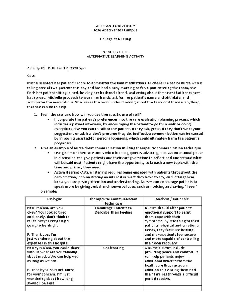 VALDEZ Activity 1 Therapeutic Relationship PDF PDF Nursing Patient Therapeutic Relationship Nursing Quizlet The nurse1 establishes and maintains this key. nurses engage in compassionate, supportive, professional relationships with their clients as part of the “art of nursing.” this chapter will review the. Choose from 500 different sets of therapeutic relationship. learn therapeutic relationship nursing with free interactive flashcards. study with quizlet and memorize flashcards containing terms like therapeutic communication, what. Therapeutic Relationship Nursing Quizlet.